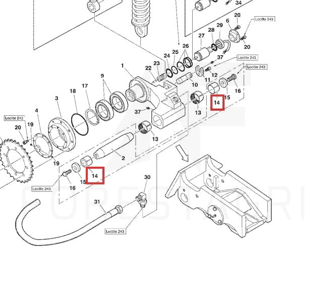 Buchse für den Bolzen, der den Messradarm am Rahmen des Harvesterkopfes befestigt.