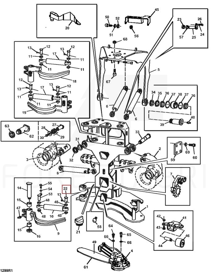 Ein Stift, mit dem der Zylinder des unteren Entastungsmessers am Rahmen des Harvesterkopfes befestigt ist. Dieses Bauteil ist mitverantwortlich für den korrekten Betrieb des Öffnungs- und Schließmechanismus des unteren Entastungsmessers.