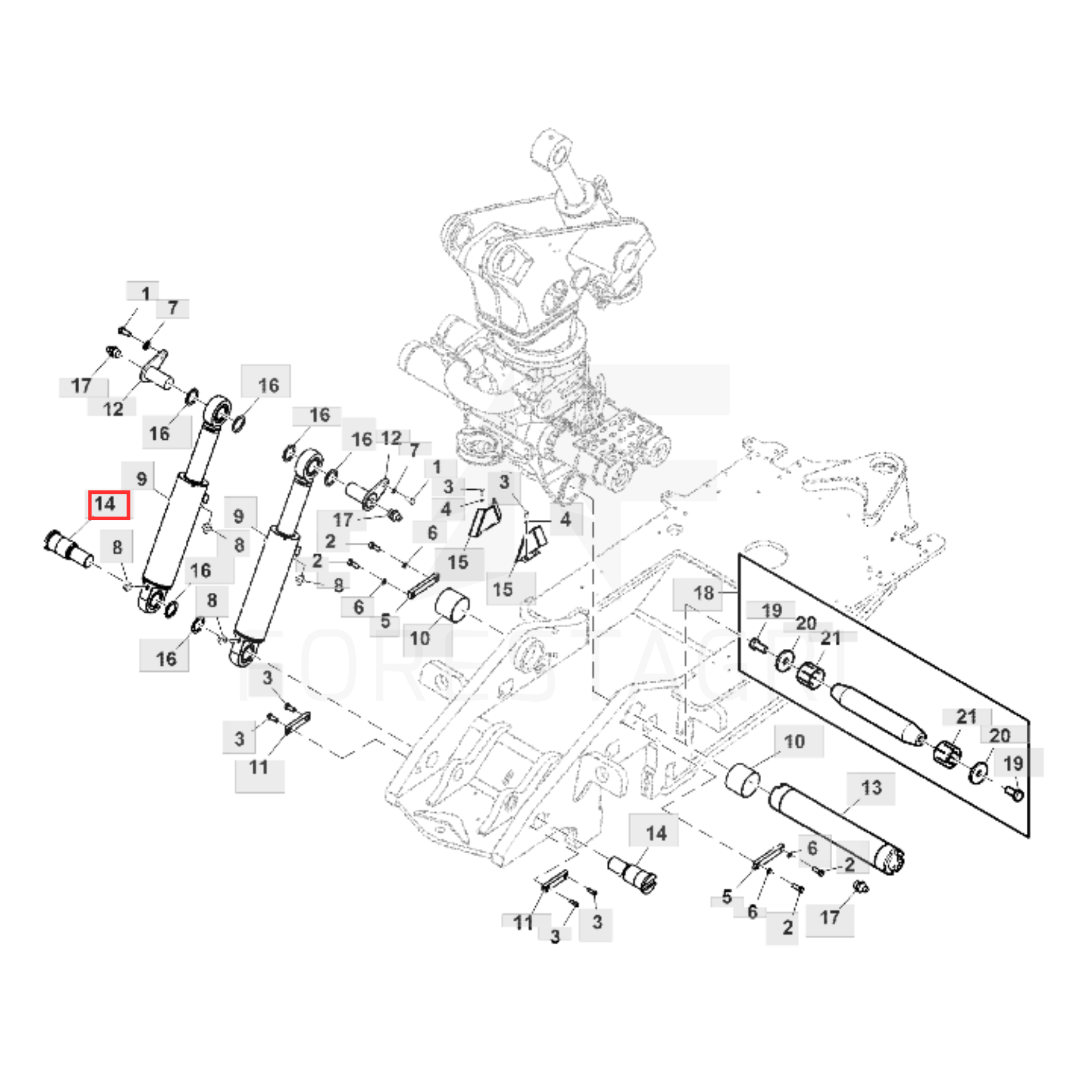 Ein Bolzen, mit dem der Kippzylinder des Harvesterkopfs am Rahmen befestigt ist. Es handelt sich um ein solides Konstruktionselement, das eine stabile Verbindung und den ordnungsgemäßen Betrieb des Mechanismus in Harvesterköpfen gewährleistet.